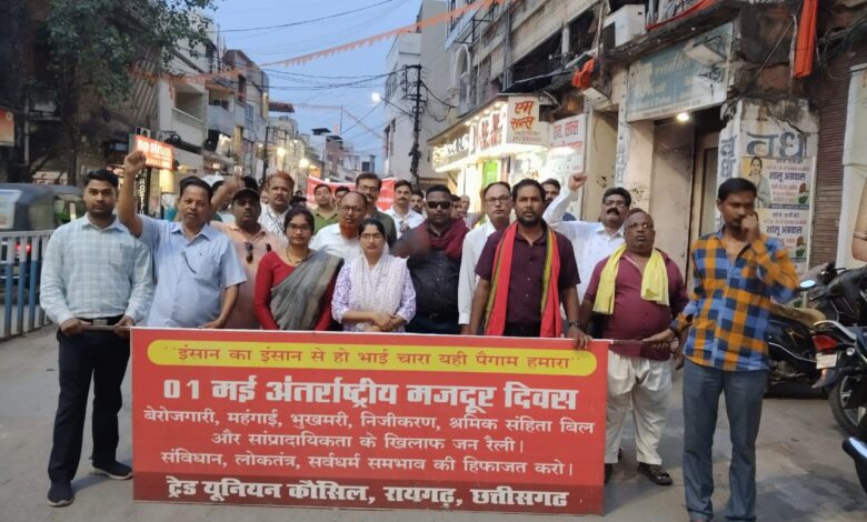 रायगढ़. ट्रेड यूनियन काउंसिल द्वारा 1मई अंतर्राष्ट्रीय मजदूर दिवस के अवसर पर स्थानीय सत्ती गुड़ी चौक में शाम 5 बजे रैली निकली गई जो शहर के सिविल लाइन स्टेशन चौक गांधी चौक सुभाष चौक गद्दी चौक हटरी चौक थाना रोड हंडी चौक होते हुए वापस सत्ती गुड़ी चौक पहुंचा, और रैली आमसभा में तब्दील हो गयी. रैली में मजदूर दिवस अमर रहे, शिकागो के शहीदों को लाल सलाम, बढ़ती महंगाई पर रोक लगाओ, बढ़ती बेरोजगारी पर रोक लगाओ, जीवन रक्षक दवाओं की कालाबाजारी नहीं चलेगी,हर हाथ को काम देना होगा, निजीकरण मुर्दाबाद, सार्वजनिक उपकर्मों को बेचना बंद करो, निजीकरण की नीति नहीं चलेगी, श्रम संहिता में बदलाव नहीं चलेगी आदि नारे लगाए गए. सिटी कोतवाली के समीप जिला बचाओ संघर्ष मोर्चा के द्वारा रैली में शामिल लोगों को पानी एवं कोल्ड ड्रिंक वितरित कर रैली में शामिल लोगों का उत्साहवर्जन किया गया.
