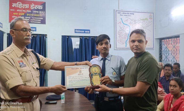 *रायगढ़, 31 जुलाई 2025* – पुलिस अधीक्षक श्री दिव्यांग कुमार पटेल के निर्देशन में कल थाना कोतरारोड़ में एक प्रेरणादायक कार्यक्रम का आयोजन किया गया, जिसमें समाज के विभिन्न क्षेत्रों में उत्कृष्ट योगदान देने वाले नागरिकों को सम्मानित किया गया। कार्यक्रम की अध्यक्षता उप पुलिस अधीक्षक श्री सुशांतो बनर्जी ने की तथा थाना प्रभारी निरीक्षक मोहन भारद्वाज की मौजूदगी में मेधावी छात्रों, समाजसेवियों और सक्रिय पुलिस मित्रों को प्रशस्ति पत्र व प्रतीक चिन्ह (मेमेंटो) देकर सम्मानित किया गया।