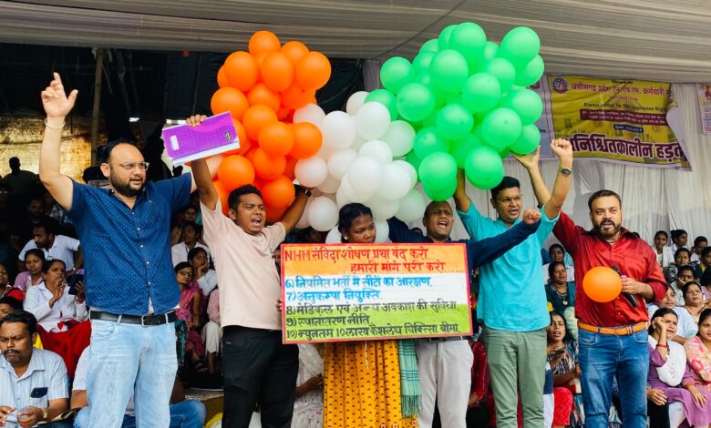 रायगढ़: छत्तीसगढ़ प्रदेश एन.एच.एम. कर्मचारी संघ की जिला इकाई-रायगढ़ के बैनर तले 16,000 से अधिक राष्ट्रीय स्वास्थ्य मिशन (एन.एच.एम.) कर्मचारी 18 अगस्त 2025 से अनिश्चितकालीन हड़ताल पर हैं। हड़ताल के छठे दिन, 23 अगस्त 2025 को शहीद कर्नल विप्लव त्रिपाठी मिनी स्टेडियम में जिले के 550 से अधिक कर्मचारियों ने गुब्बारे हवा में छोड़कर 20 वर्षों की शोषण प्रथा को समाप्त करने हेतु सरकार का ध्यान आकर्षित किया। गुब्बारों के साथ अपनी 10 सूत्रीय मांगों को प्रतीकात्मक रूप से हवा में छोड़ा गया, जो सरकार के खोखले वादों की तरह अब तक अनसुलझी हैं।
