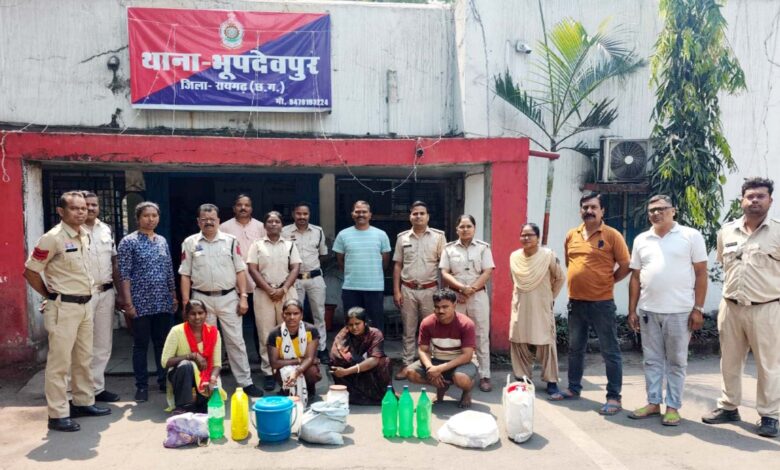 रायगढ़, 16 मार्च 2026/ जिले में अवैध मदिरा के निर्माण और बिक्री पर रोक लगाने के लिए प्रशासन लगातार सख्त कार्रवाई कर रहा है। इसी कड़ी में पुलिस और आबकारी विभाग की संयुक्त टीम ने भूपदेवपुर थाना क्षेत्र के ग्राम-बिलासपुर और किरीतमाल में कार्रवाई करते हुए बड़ी मात्रा में अवैध महुआ शराब और महुआ लाहन जब्त किया है। इस दौरान कई आरोपियों के खिलाफ आबकारी अधिनियम के तहत प्रकरण दर्ज कर जांच शुरू कर दी गई है।