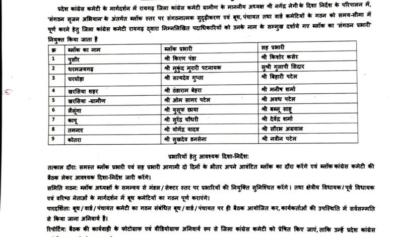 जारी सूची के अनुसार—पुसौर ब्लॉक कांग्रेस कमेटी का किरण पंडा को (प्रभारी), किशोर कसेर को (सह प्रभारी) धरमजयगढ़: मुकुंद मुरारी पटनायक को (प्रभारी), गुलाबी सिदार को (सह प्रभारी)
