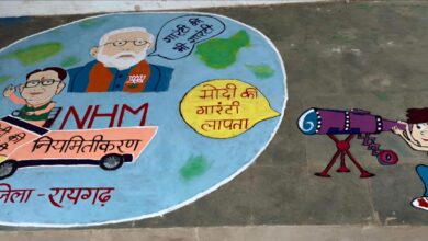 मोदी की गारंटी की खोज में रंगोली, कोरबा में एक और मौत:एनएचएम कर्मचारियों की हड़ताल का 16 वां दिन